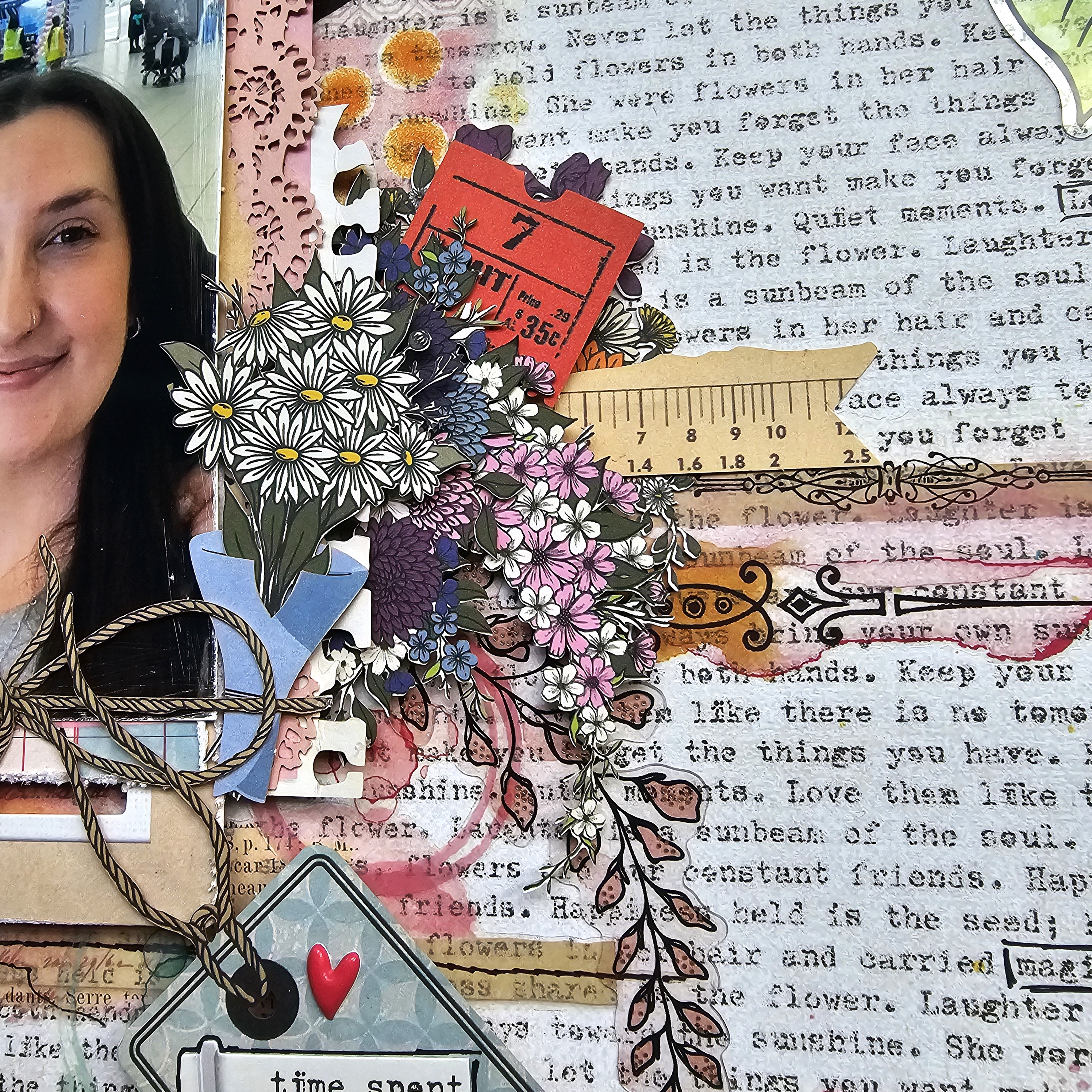 I have used the Mustard yellow from the Whispering Way 12 x 12 solid papers. I then used the Sunshine Days paper from the Whispering Ways 12 x 12 paper collection, tearing this down about half an inch all round before adhering the page to the Mustard yellow paper, curling up the torn edges with my fingers. I have then used the square pattern of the Whispering Way fabric tape and cut this like stairs - worked out where I would like to add my photo and the adhered the fabric tape to the paper, before adding my photo, using the bonus sheet from the solids paper collection for the matting. I then used the large circle frame from the chipboard pieces and cut this in half adhering each half under the photo. Isn't this chicken wire from the lasercut elements just fabulous - this has been added to the left of the photo on the circle edge and the right top corner of the photo.I have also added the chipboard piece with the wording "The Echo of Laughter in the Barnyard Lives On". (There are some other great phrases included in the chipboard pieces pack :)